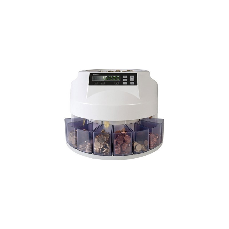 Comptadora i classificadora de monedes. Compte i classifica 220 monedes per minut. Capacitat de 300 - 500 monedes. Funció de suma i de feixos. Valor total i quantitat per denominació. Exporta els resultats de l'recompte a la impressora Safescan tp-230. (Disponible com a opció). Parada automàtica quan una tassa estigui plena. Ràpid i fàcil d'utilitzar.